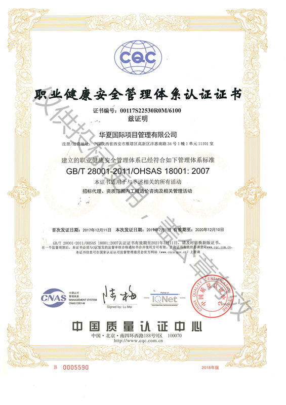 職業健康安全管理體系認證證書